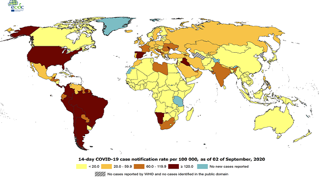 Ο ρυθμός εξάπλωσης της πανδημίας μοιάζει να σταθεροποιείται παγκοσμίως, με ένα εκατομμύριο νέα κρούσματα να καταγράφεται κάθε τέσσερις ημέρες από τα μέσα Ιουλίου.