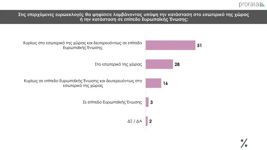 Το 51% δηλώνει ότι θα ψηφίσει στις ευρωεκλογές 2024 λαμβάνοντας υπόψη κυρίως την κατάσταση στο εσωτερικό της χώρας και δευτερευόντως σε επίπεδο ευρωπαϊκής ένωσης. Για το 46% οι ευρωεκλογές είναι ευκαιρία να στείλει ένα μήνυμα επιβράβευσης σε κάποιο κόμμα. Από την άλλη το 33% βλέπει αυτές τις κάλπες ως ευκαιρία για να στείλει ένα μήνυμα δυσαρέσκειας.
